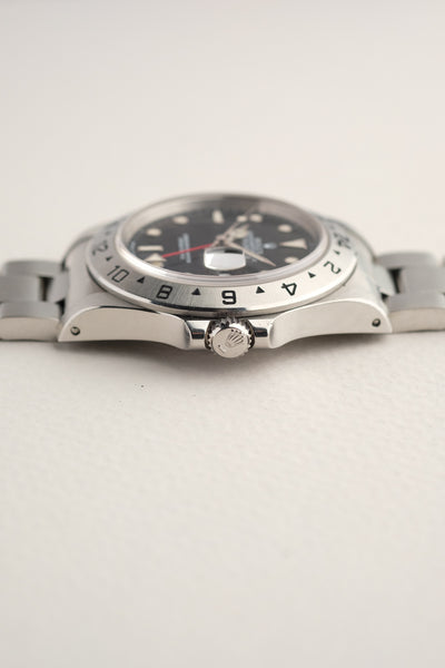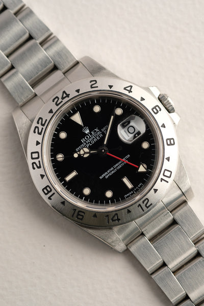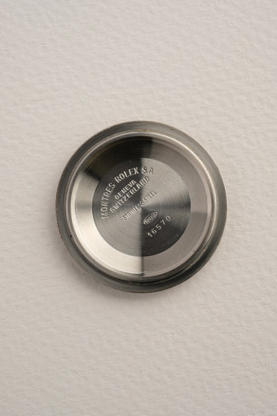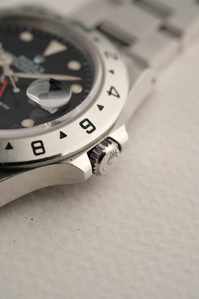 Description: The Black dial 16570 is a favorite of ours. This early explorer II houses a tritium dial which allows for a creamier lume than its later luminova counterparts. The case is the star here showing original thick bevels. This one should go quick as it’s one of the few sport neo-vintage watches to be had under $8,000