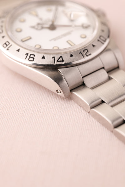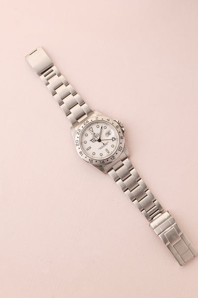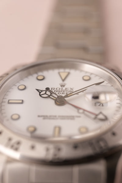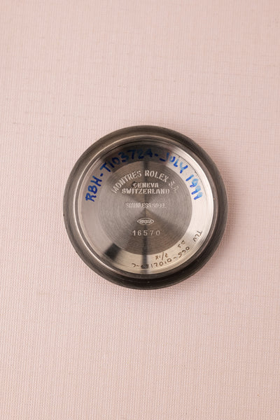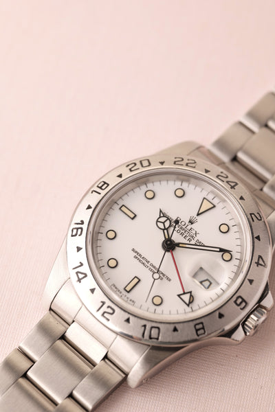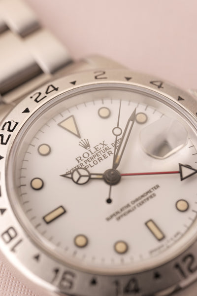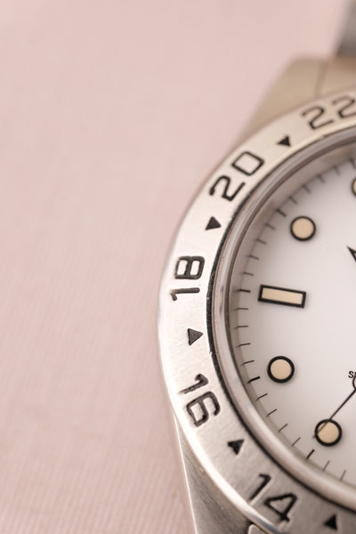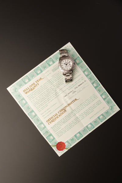 Description: An excellent 16570 Polar Explorer from 1991. The case appears slightly polished but still remains super thick. Yellowing appearing on the lume which will eventually turn chi-chi. Papers still paired with the watch.