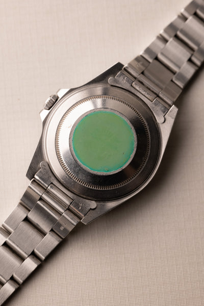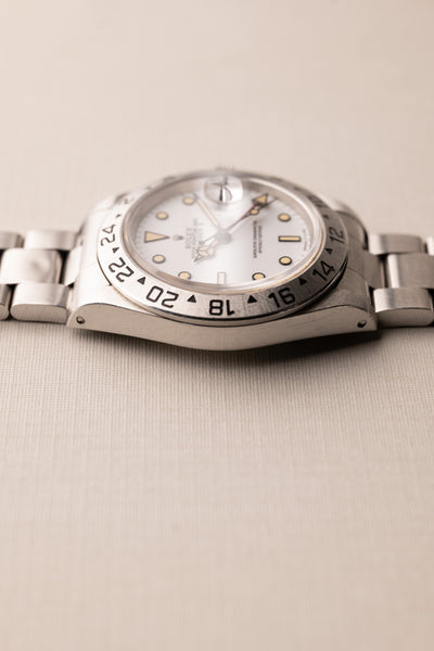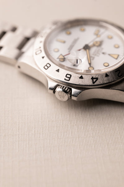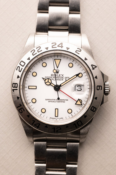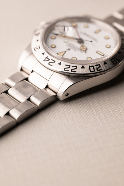 Description: The Chi-Chi Polar Explorer II refers to the extreme yellow coloring present on the hands and dials of this Explorer II. These are one of the most desirable Explorer II’s and are rarely seen with this extreme patina on the lume. The Case is excellent and appears unpolished including having the original caseback sticker.