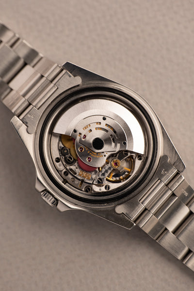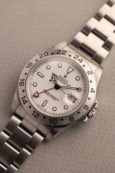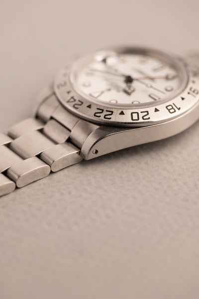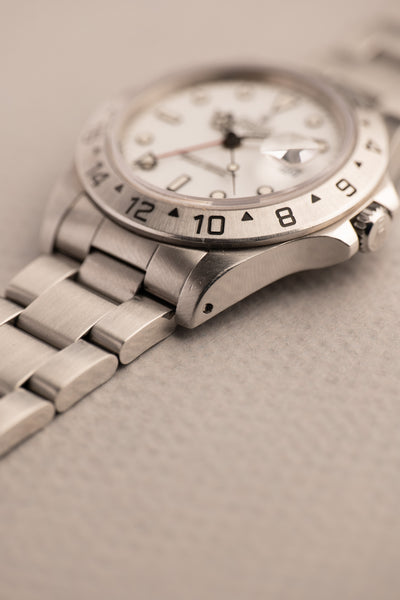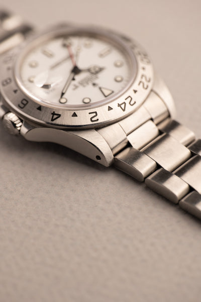 Description: Perhaps the last of the great tritium watches to get its moment in the sunlight, the 16570 has increased tremendously in value over the past couple of years. The polar white dial is something that truly makes this watch unique. The black surrounds also give this tritium dial explorer the perfect contrast to show off its yellow tritium lume. The case appears unpolished and retains its factory caseback sticker.