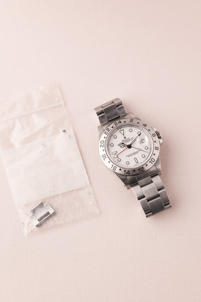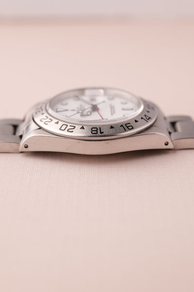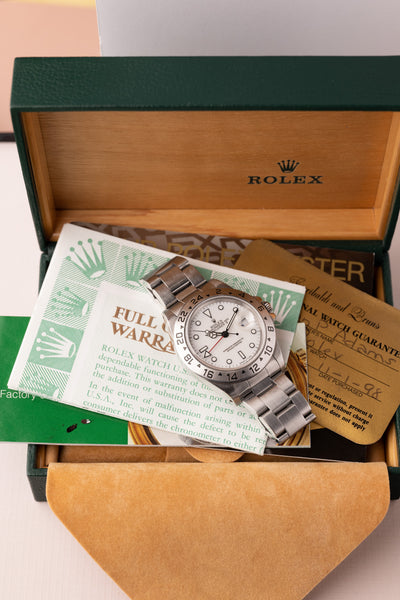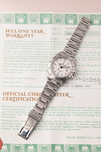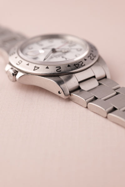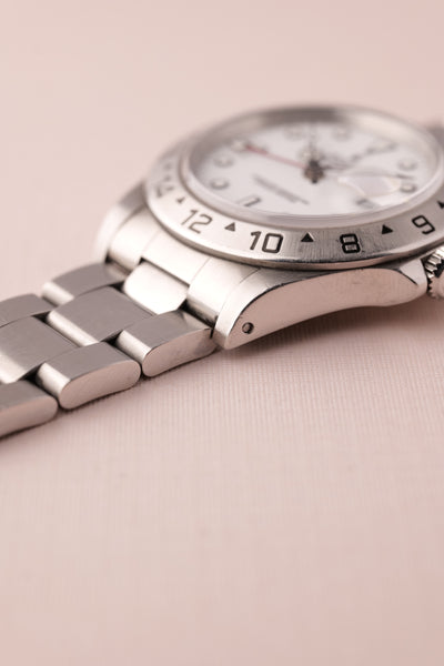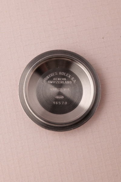 Description: Perhaps the last of the great tritium watches to get its moment in the sunlight, the 16570 has increased tremendously in value over the past couple of years. This Polar Explorer has light yellow tritium lume which makes for a very high contrast watch with the black border surrounds. The case appears unpolished and retains its factory caseback sticker.