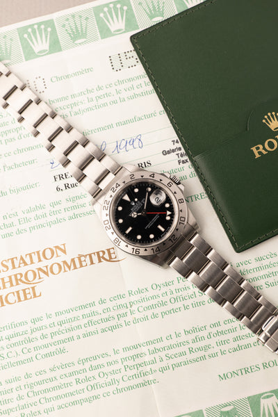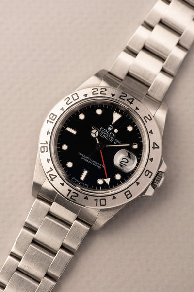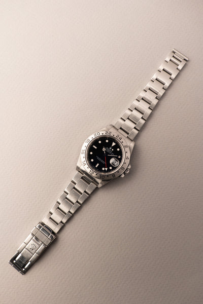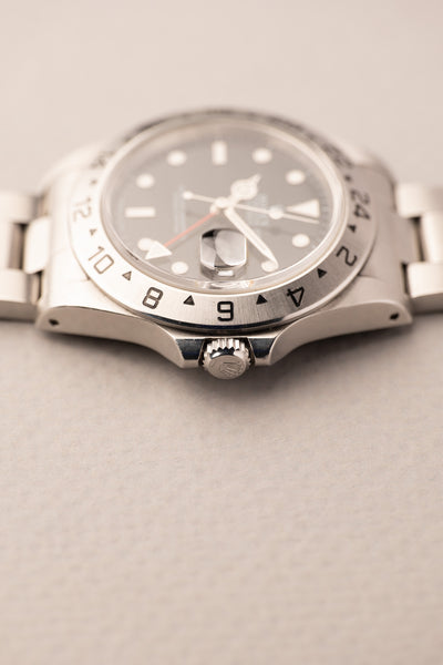 Description: The Black dial 16570 is a favorite of ours. This early explorer II houses a tritium dial which allows for a creamier lume than its later luminova counterparts. The case is the star here showing original thick bevels. This one should go quick as it’s one of the few sport neo-vintage watches to be had under $8,000