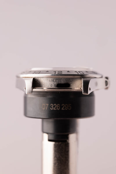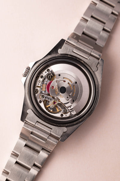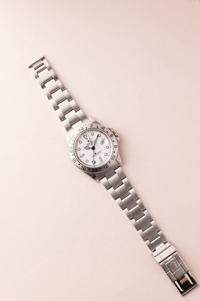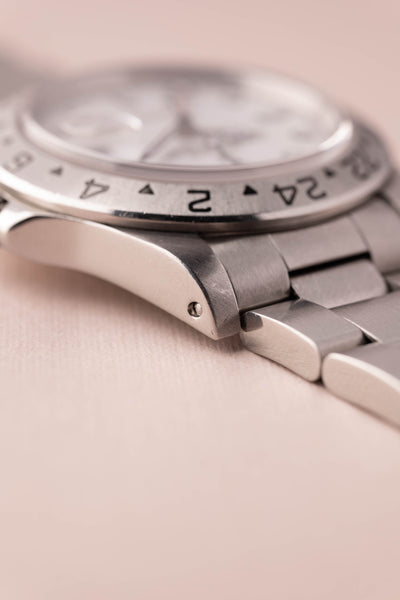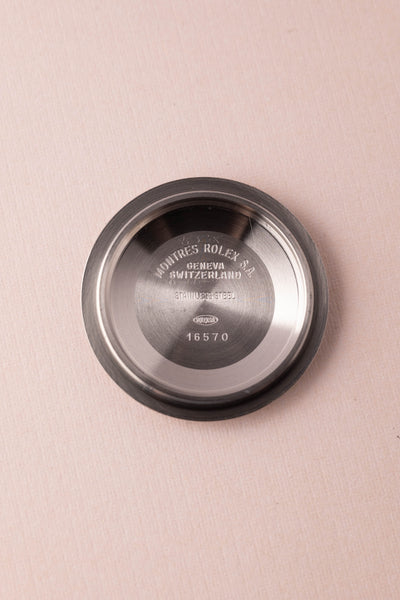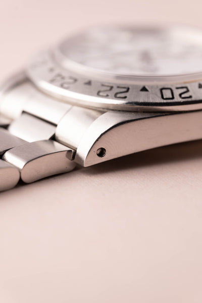Description: Perhaps the last of the great tritium watches to get its moment in the sunlight, the 16570 has increased tremendously in value over the past couple of years. This Polar Explorer has light yellow tritium lume which makes for a very high contrast watch with the black border surrounds. The case appears unpolished and retains its factory caseback sticker.