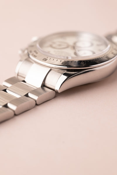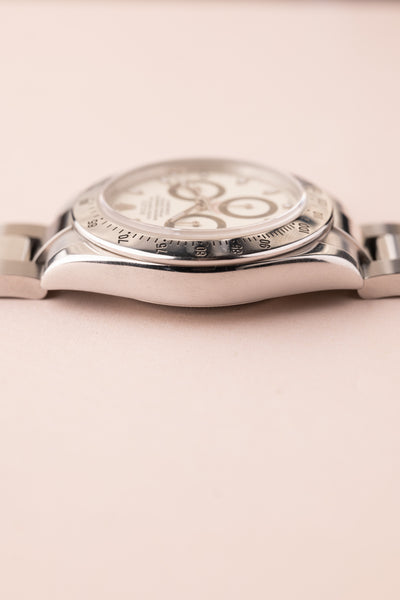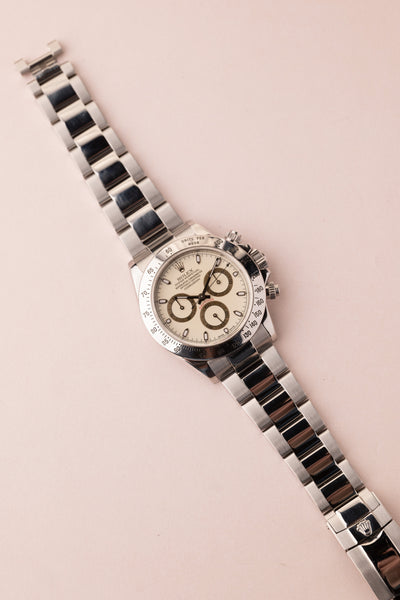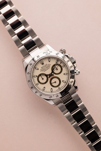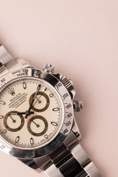 Description: Very Rare “Panna Cotta” Dial Rolex 116520. Nicknamed after the sweet creamy beige desert, this dial is rarely seen in this reference. Only a few white dials achieve this creamy hue color and is highly desired amongst collectors. Excellent dial and case. P serial.