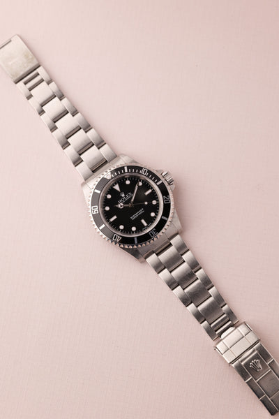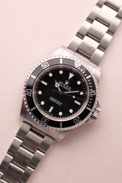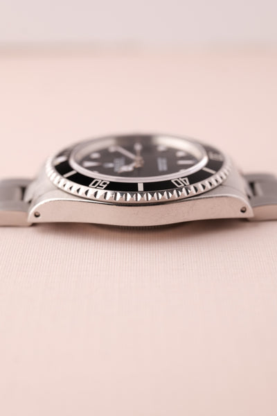Description: Out of the Neo-Vintage watches that have gained tremendous popularity over the past few years perhaps none have been more overlooked than the 14060 no date Submariner. Produced in far fewer numbers than the more popular 16800 reference, this Sub model provides a clean symmetrical dial without cluttering up the face of the watch with a date function or cyclops. The case appears in polished ano retains sharp and even bevels throughout the case. This model is a luminova model variant and still glows under intense UV.