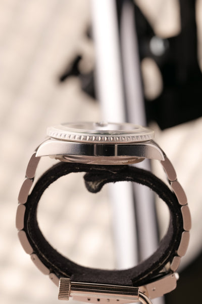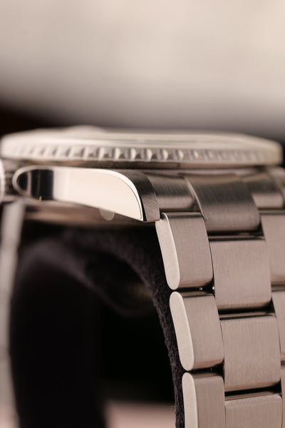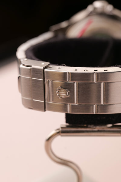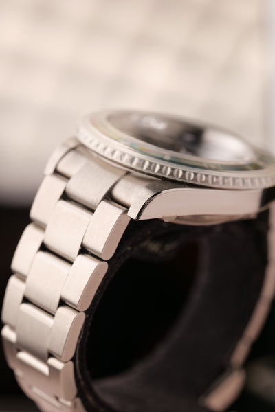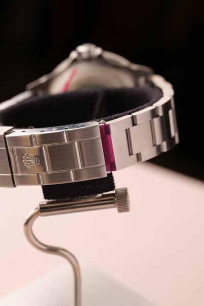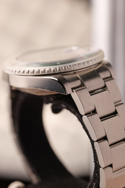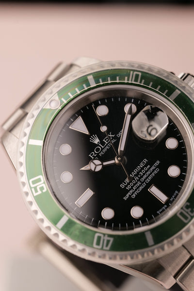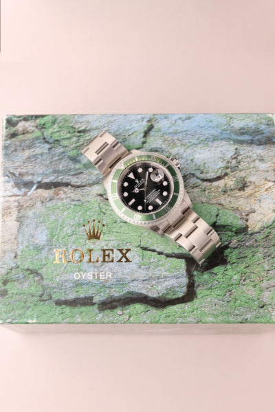 Description: 2003 Kermit Flat 4 Submariner. This is a rare Kermit that’s been left as NOS (new old stock) condition. Original stickers are all around the watch and the original Bezel cover is still on. This will be one of the cleanest Kermit Submariners you’ll see from early 2000’s. Watch with original Box & Card and accessories. This is one of those watches that will likely be tucked away in a safe and appear in auction in another decade we feel like, however part of us wishes someone will rip off the stickers and wear a brand new Kermit as a daily watch :)