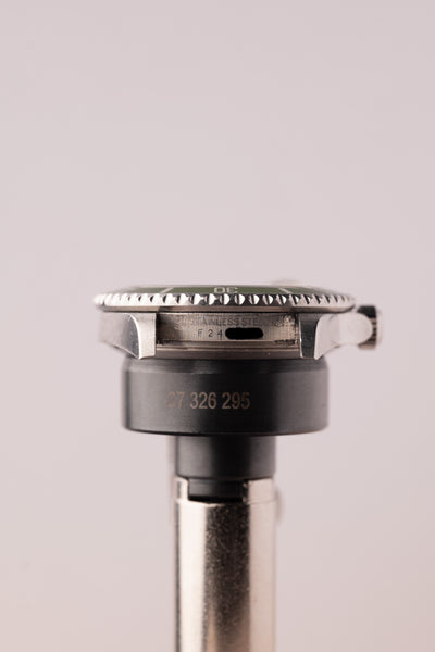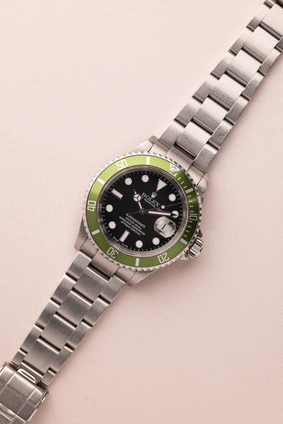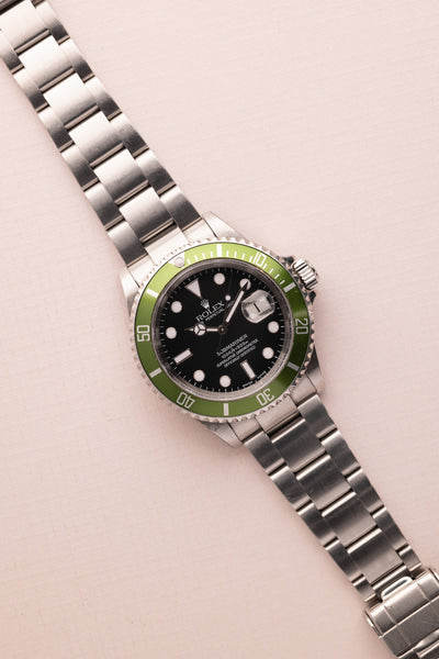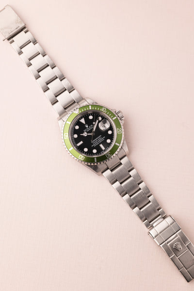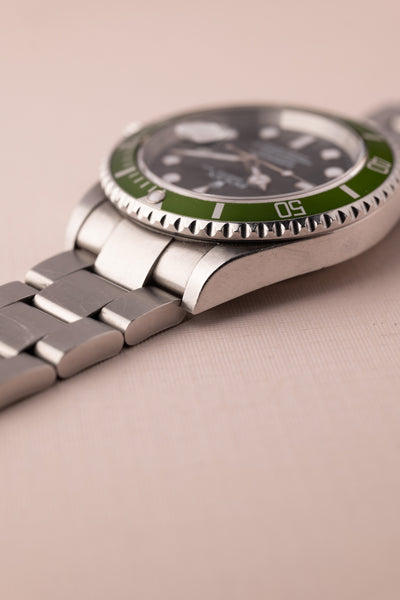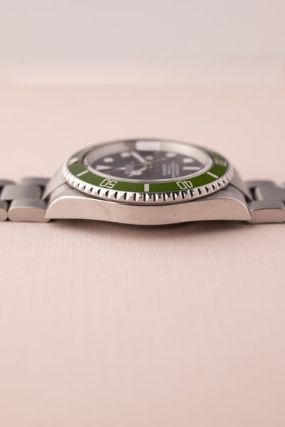 Description: 2003 “F” serial Rolex “Kermit” “Flat-Four” 16610LV Anniversary Submariner with Box and Papers. This Watch is a collector’s grade watch. It retains it’s original factory bevels on the case and is naked without box and papers. The features and attributes of this kermit make this a MK1 Kermit which is highly collectable with its unique D1 wide spaced dial and B1 Flat four Bertolli insert. The insert, furthermore has turned into a lime green color which is indeed rare for flat 4 inserts. The watch remains unpolished with case back sticker. Perhaps what makes this watch great is that it is without box and papers. This factor allows the purchaser to not pay that 25% premium for a full set watch and is perfect for the collector that wants to wear their watches as opposed to stuff it in a safe.