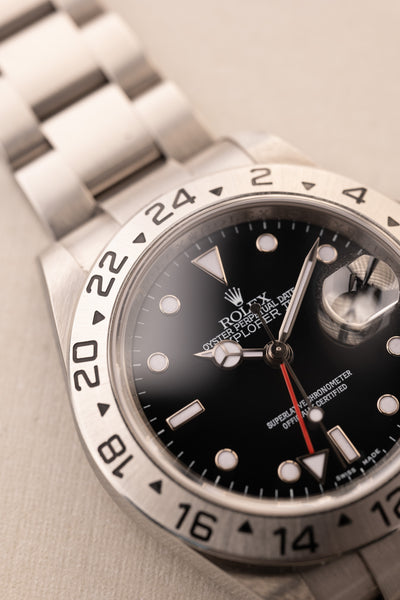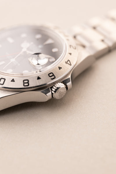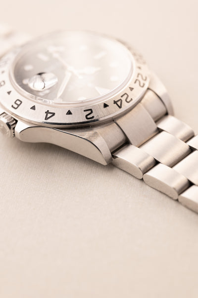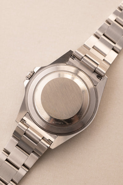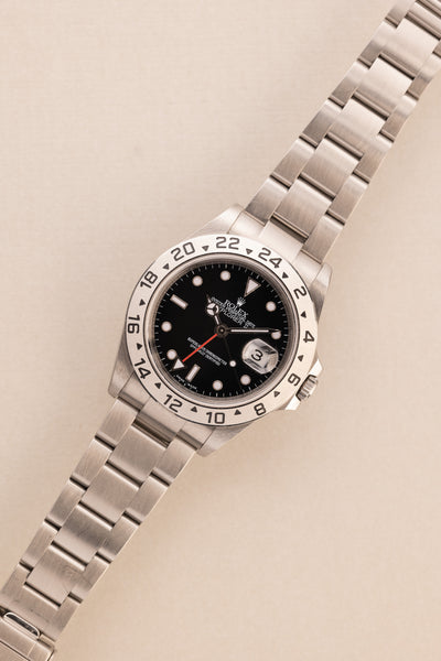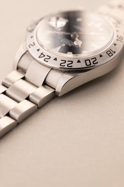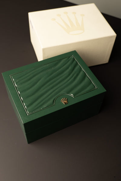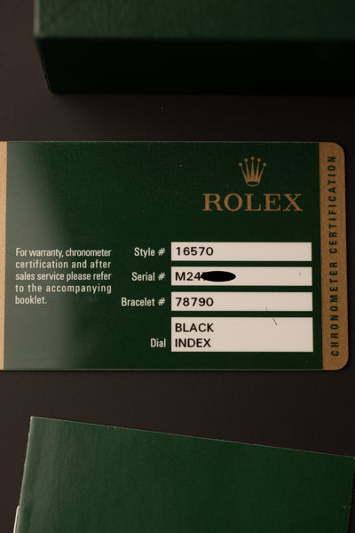 Description: The Black dial 16570 is a rare specimen as it comes unpolished with a full set , Box and papers included. The case looks like it has hardly been worn. The dial is a luminous dial which is correct for this late 16570 from 2007