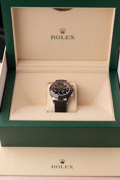 Description: This 2019 White Gold Ceramic Daytona oysterflex with black diamond dial is a gorgeous modern watch. The diamond dial is the rarer black dial for obvious reasons.