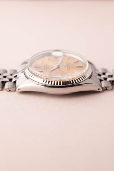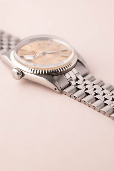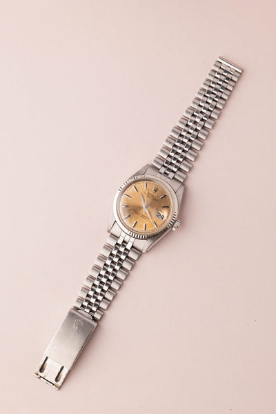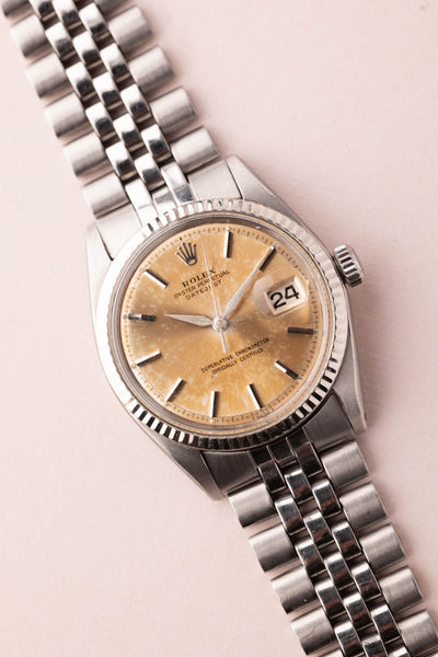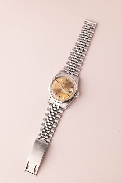 Description: These early 1601 variant datejust’s provide so much character for a 36mm watch. The original silver dial has oxidized and turned into a bronze-ish patina similar to other dials of this era. The dauphene hands are unique to these early datejusts and are matching to this watch. The case is in excellent condition as well.