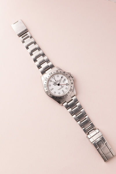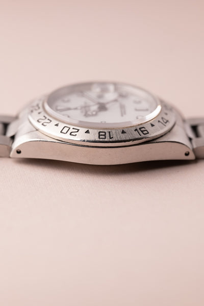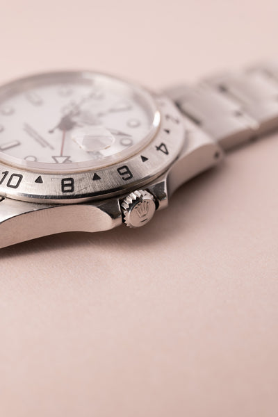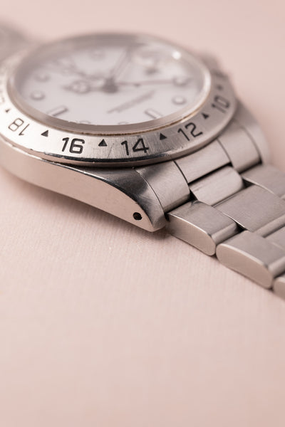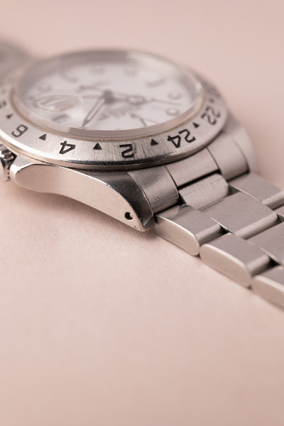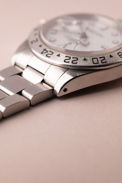 Description: An excellent 16570 Polar Explorer from 1991. The case is sleeve polished and still remains super thick and bevels intact. The tritium shows a much whiter polar white but matches with the hands and dial. This is a pure polar watch for those that want a punchy white color.