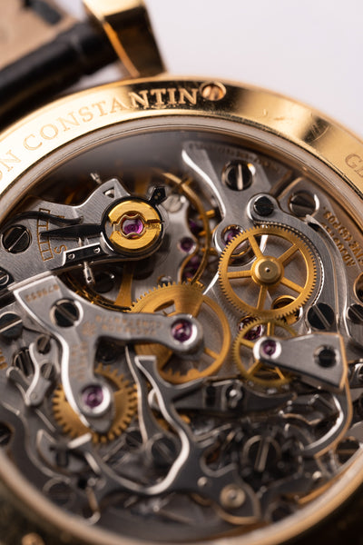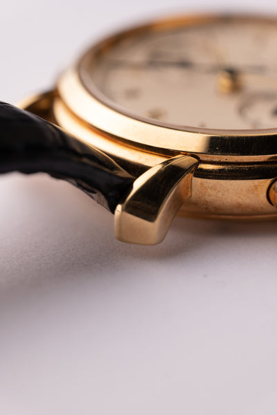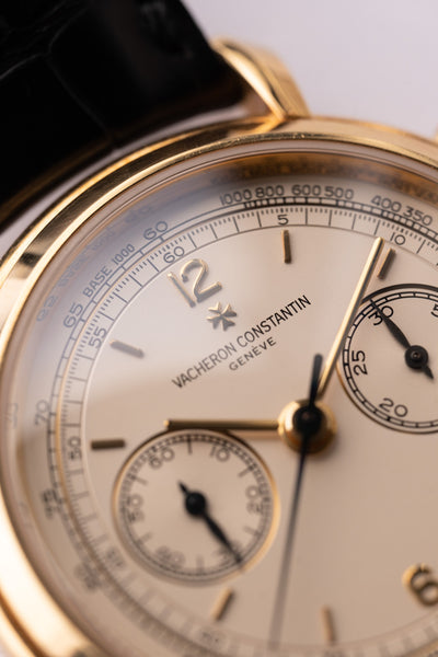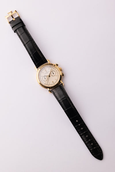 Description: introduced in 1989, paying tribute to the Geneva watchmaker’s archives. The origins of the watch can be trace back to Vacheron’s iconic reference 4178, from the 1940s. This is the perfect Chronograph dress watch with the 18k yellow gold case with a champagne dial paired with the Crocodile skin strap.